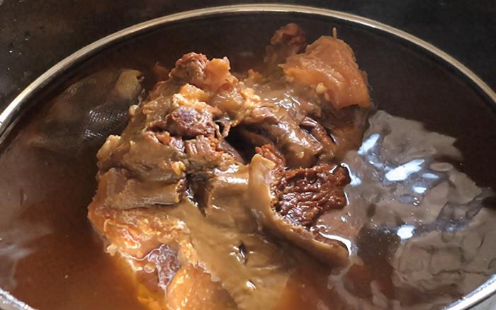 往裝有牛肉的鍋中繼續加入香料袋、適量鹽、老抽,雞精,大火煮開後轉小火慢燉3個小時左右,煮至牛肉軟爛(待筷子能輕鬆戳透牛肉就是熟了)。滷好後再把牛肉繼續泡在湯汁裡半天,以便更加入味。