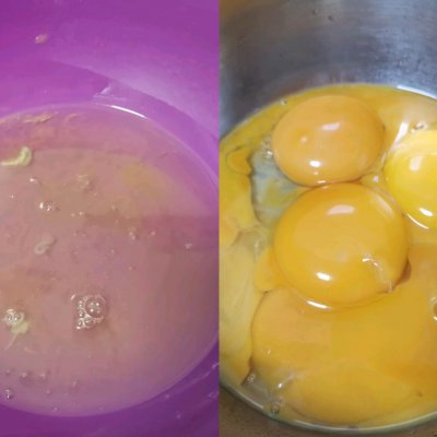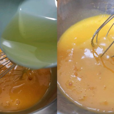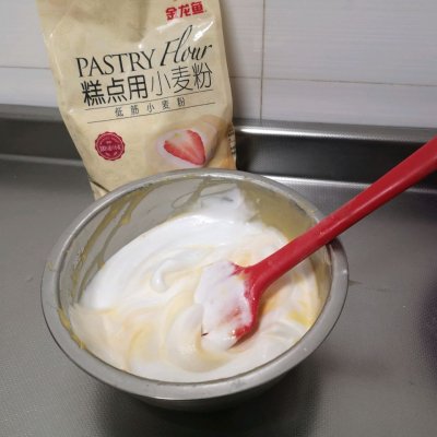 4、蛋黃加入玉米油及牛奶攪拌乳化之後加入低筋麵粉拌到無干粉狀態