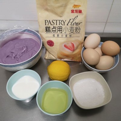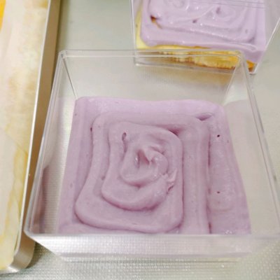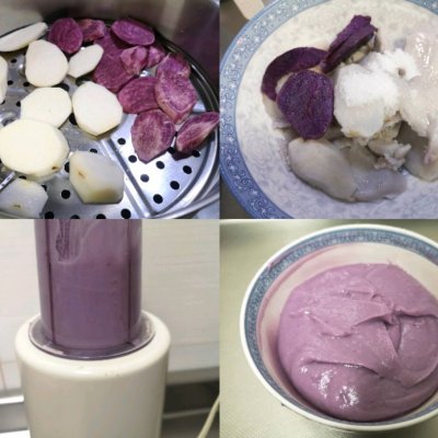 2、芋頭,紫薯去皮蒸熟,加入30克糖,50克牛奶,20克淡奶油用料理機攪拌成細膩狀態,冷藏備用。(紫薯也可以用紫薯粉代替)