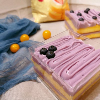 13、再放上一片蛋糕,用裱花嘴的擠上紋路,放上藍莓即可,冷藏30分鐘。