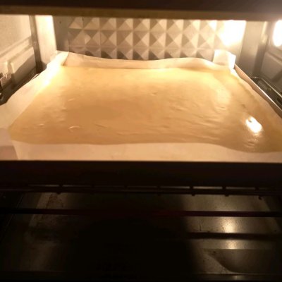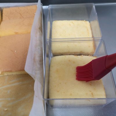 11、盒子先裝一塊蛋糕,刷一層糖酒水,(糖與水果酒混合,沒有可不刷)主要是讓蛋糕口感更好。