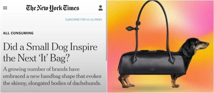 Le Teckel法語翻譯過來是「臘腸犬」,沒錯,這隻包正是設計師以他心愛的臘腸犬為靈感設計的,包身就像牠又細又長、滑溜溜的身體。一隻幸運的小狗!▼