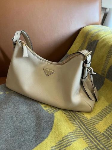 說起來,我去年利用率最高的兩個包之一就有Prada(另一個是麂皮小lindy)。是一隻加長版的hobo,名字叫做Aimée(法語「寵愛」的意思),真的非常能裝,又輕輕軟軟的,有段時間每天出門都用。▼