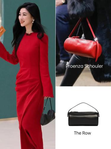 The Row圓筒包就是朱珠拎著去參加浪姐那隻小黑包。區別在於,The Row(右下)更扁不是圓筒,也少了閃閃發光的小銀扣,更低調。▼